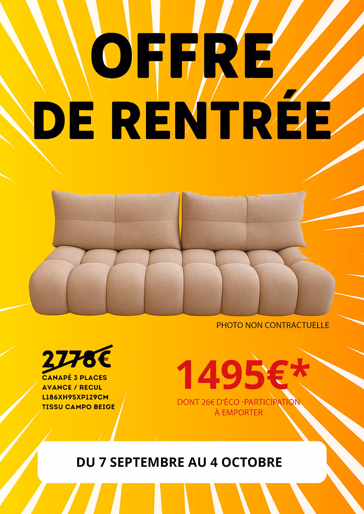 Jusqu’au 04 octobre profitez de tarifs exceptionnels pendant l’Offre de rentrée. Canapé 3 places à 1495€ !